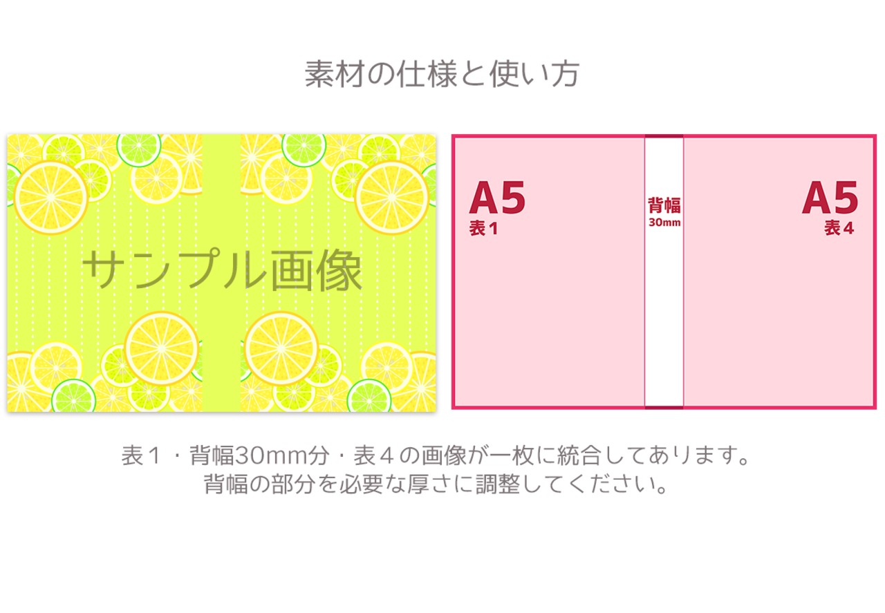 A5サイズの印刷物用のデータ、表1+背幅+表4・一体型のデザインを収録しています。