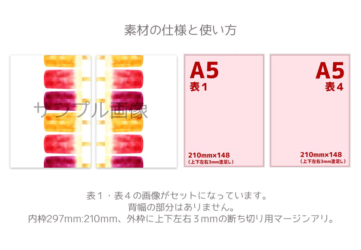 A5サイズの印刷物用のデータ、表1・表4のデザインを収録しています。