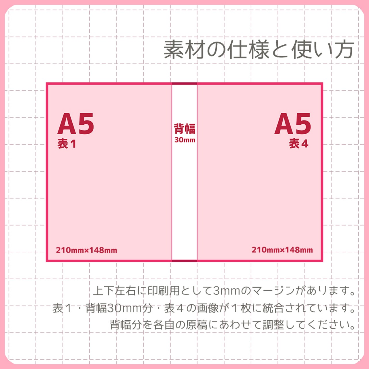 A5サイズの印刷物用のデータ、表1+背幅+表4・一体型のデザインを収録しています。